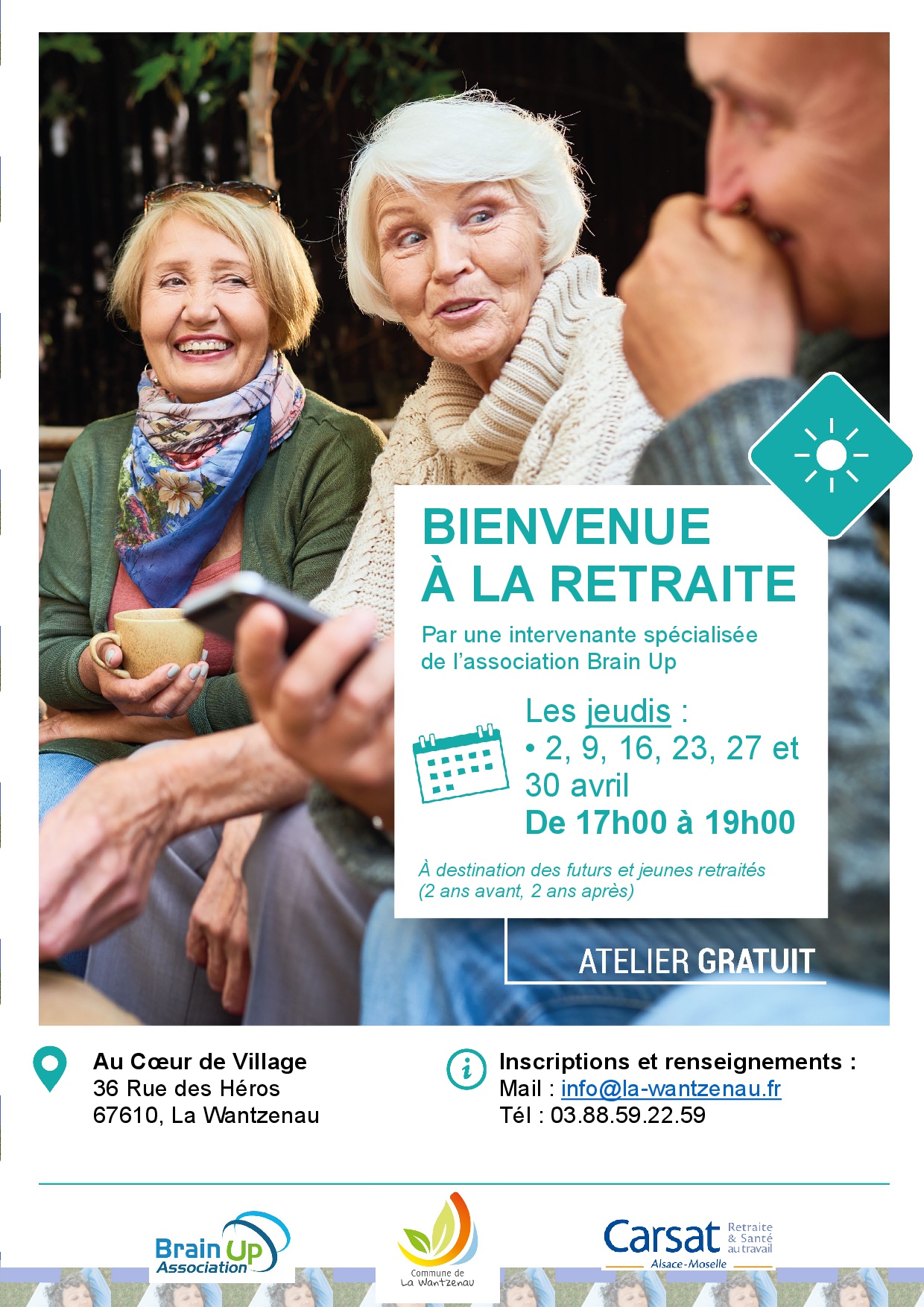 Le programme est ouvert à toute personne à la retraite depuis moins de 2 ans. Il est gratuit et se compose de 6 séances de 2 heures. Il se déroulera les jeudis 2, 9, 16, 23, 27 et 30 avril de 17h00 à 19h00 au Coeur de Village (36 Rue des Héros, 67610 La Wantzenau).