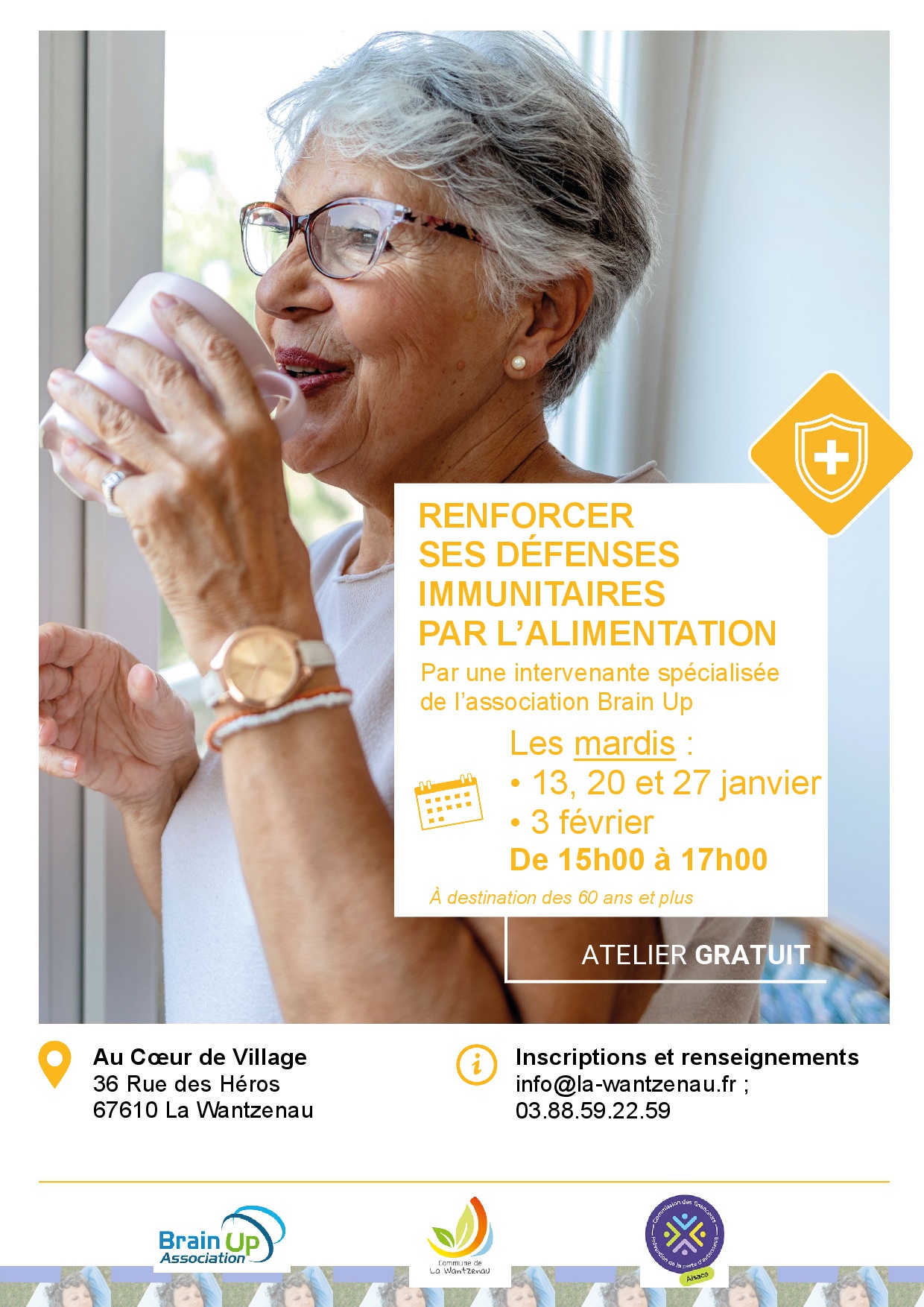 Pour comprendre le rôle de notre alimentation dans le maintien et le renforcement de nos défenses naturelles, le CCAS de La Wantzenau en partenariat avec l’association Brain Up, vous propose de participer au programme "Renforcer ses défenses immunitaires par l’alimentation".